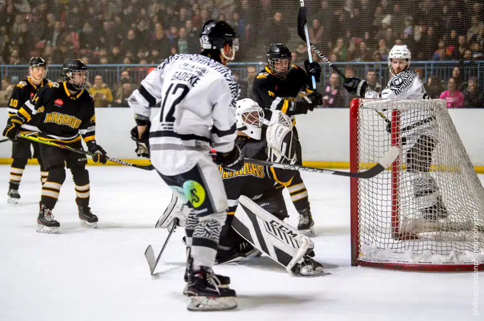 Chelmsford arrived with a short bench of only 11 players and no coach, which is less than ideal to say the least. The Warriors have the first shots of the game, forcing a save from Luke Clark and then another from the resulting face-off.